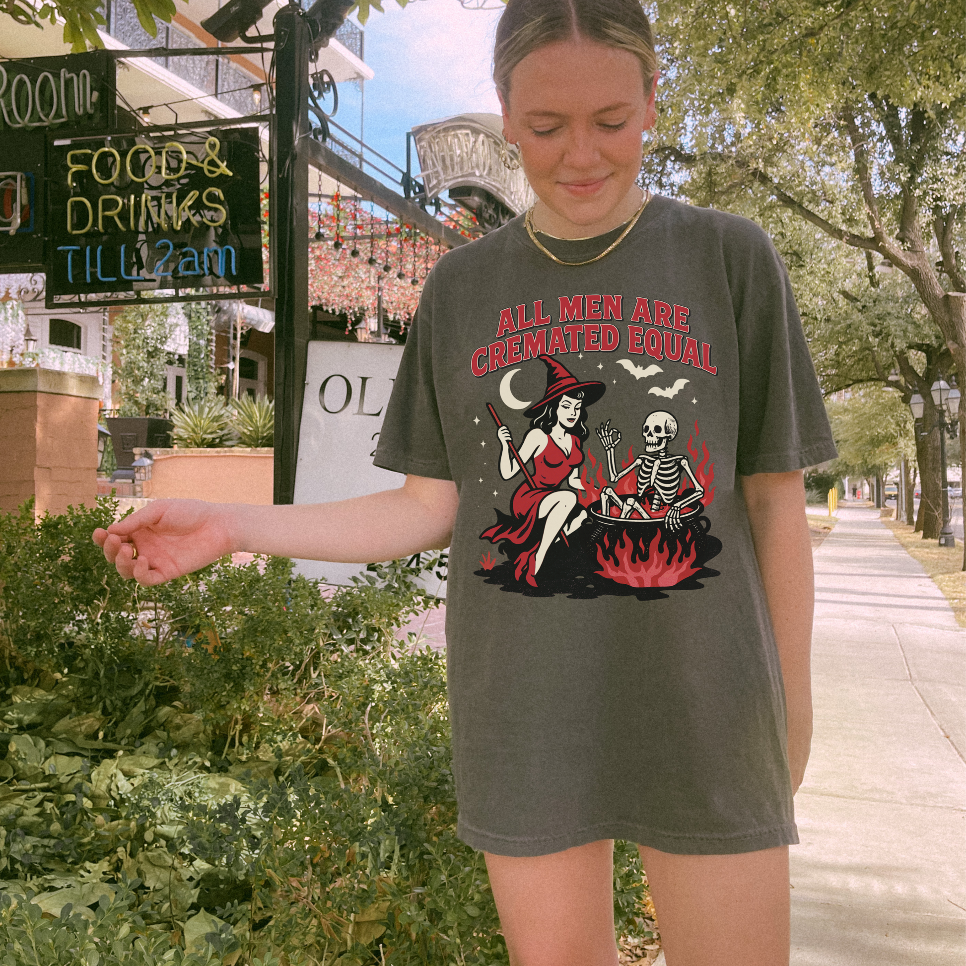 Spooky and sassy, this Halloween shirt makes a bold statement: All Men Are Cremated Equal. Perfect for October outfits, Halloween parties, or anyone with a dark sense of humor.