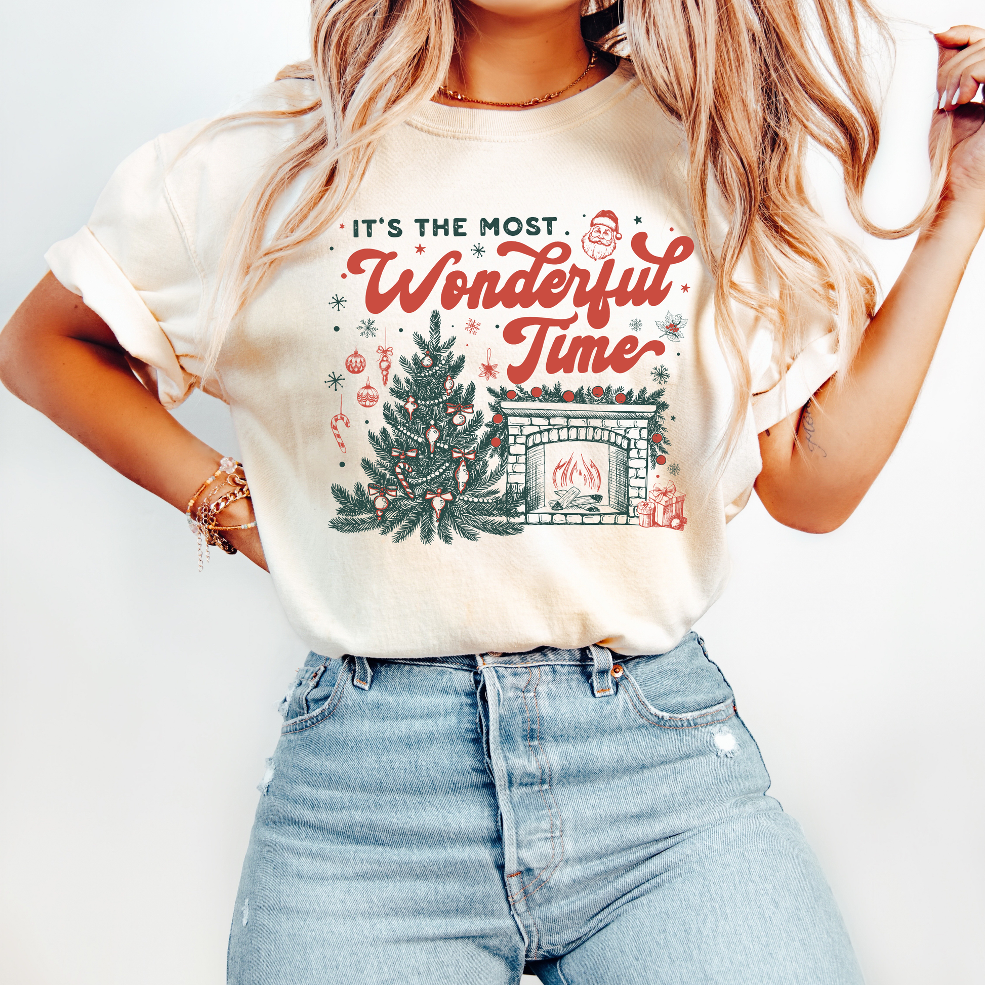 Celebrate the season in the coziest way with this festive “It’s the Most Wonderful Time” graphic tee. A nostalgic fireplace scene, a classic Christmas tree, and vintage-style lettering make this the perfect holiday shirt for December errands, cookie baking, gifting, and everything in between.